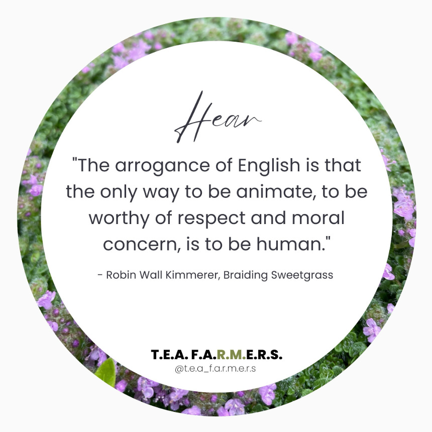 When we become open to the idea that a tree might have something to say, we can begin to HEAR what the Earth is trying to teach us. The R. and M. in TEA FARMERS stands for ‘Reciprocity Movement’. For us this means listening to and recognizing that there are things to be learned from the living lands and beings around us; and letting these learnings motivate us towards justice. What sustainable change can be found without first humbly listening?